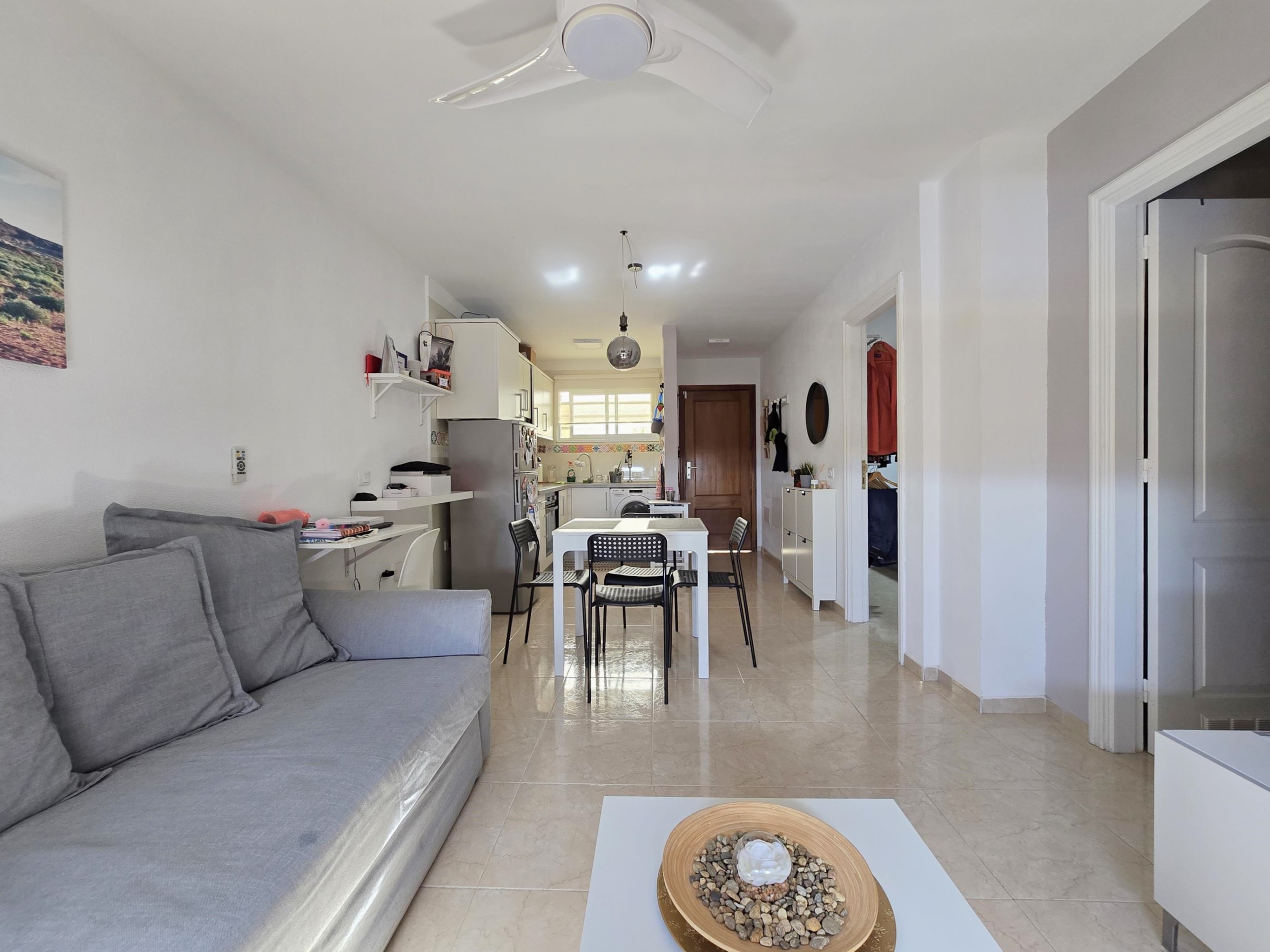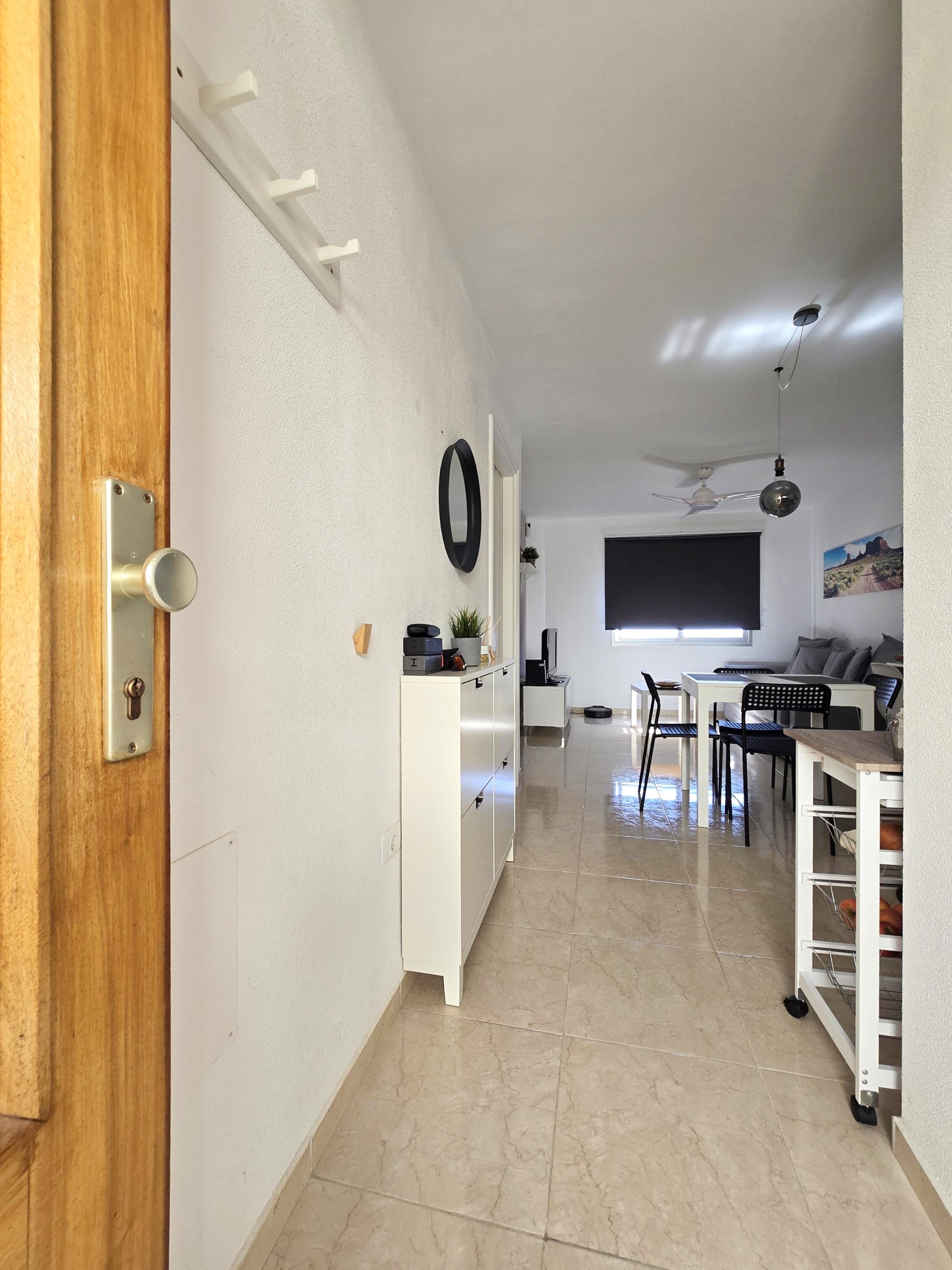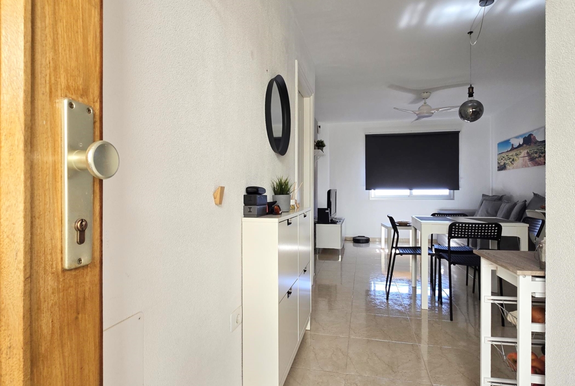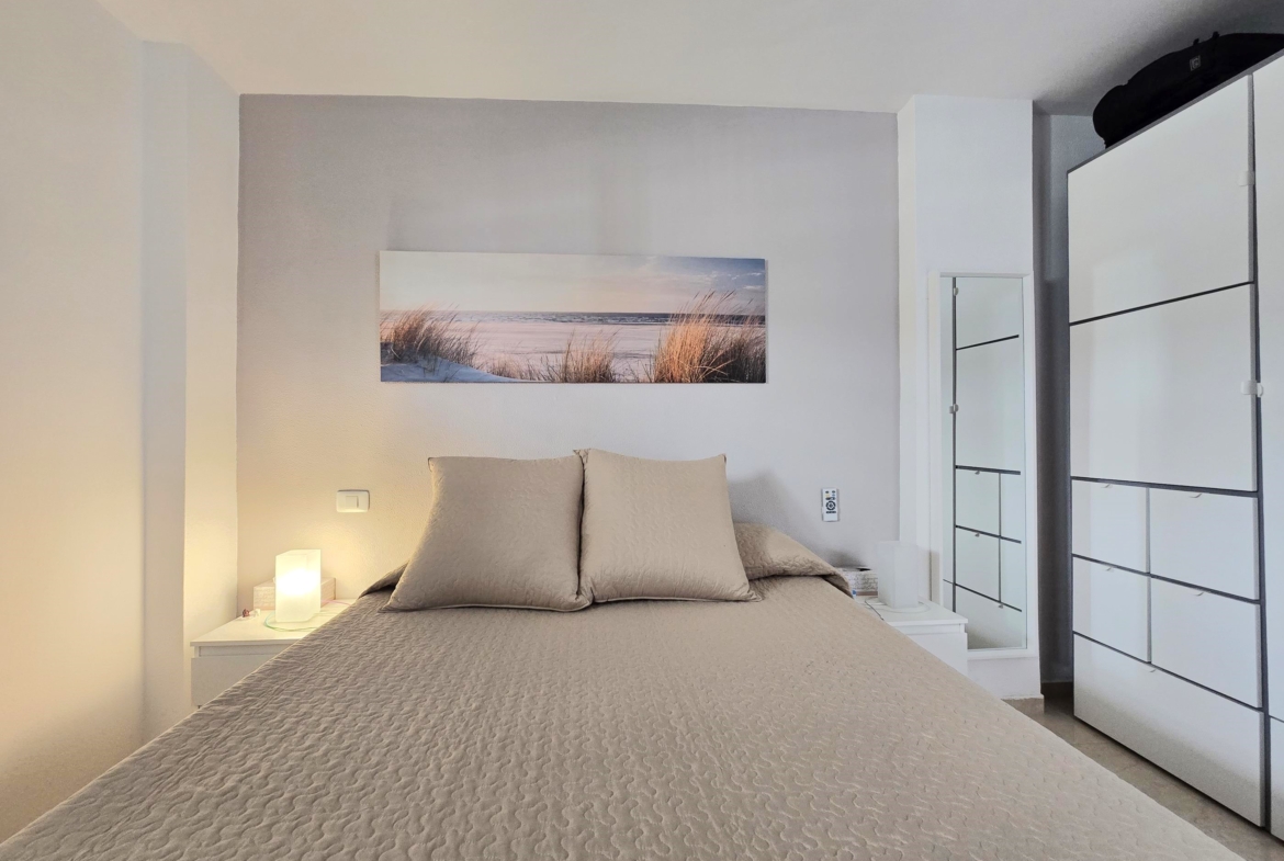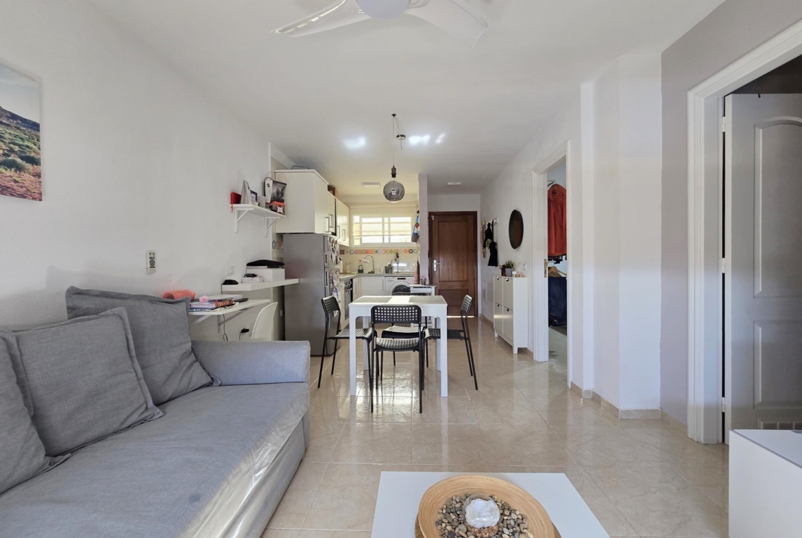La vivienda, que se distingue por su excelente distribución sin pasillos y con el máximo aprovechamiento del espacio, lo que permite que a pesar del espacio sus estancias sean amplias. Consta de recibidor, un espacio diáfano abierto donde se encuentran cocina totalmente equipada, comedor y salón comedor exterior con vistas al mar. Por último, un baño completo con ducha de obra.